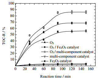 從圖 5可以看出,不同反應(yīng)體系下水樣TOC的去除率增勢均在反應(yīng)時間90 min時趨于平緩,水樣TOC的去除率從大到小排列為:O3/多組分催化劑 > O3/Fe2O3催化劑 > O3,分別為85.39%,68.49%和54.89%。與無催化劑O3氧化體系相比,O3/多組分催化劑體系和O3/Fe2O3催化劑體系對水樣TOC去除率分別增加了30.50%和13.60%。這是由于催化劑除了自身對水樣中的有機(jī)物具有一定吸附作用并能利用間隙分割臭氧氣泡使其變小從而增加氣液混合程度,還可以與臭氧、水樣形成非均相催化氧化體系,增加臭氧在水中分解產(chǎn)生的羥基自由基數(shù)量,從而促進(jìn)水樣深度氧化。多組分催化劑相較于Fe2O3催化劑,多了鈷、銅、錳的氧化物,能夠進(jìn)一步促進(jìn)臭氧分解反應(yīng);可能含有p型氧化物,p型氧化物較之n型金屬氧化物的氧吸附量更大,且吸附的O3、O2會電離成O-、O2-和OH-,使陰離子物質(zhì)趨于穩(wěn)定,對臭氧分解反應(yīng)更有活性[13-15]。