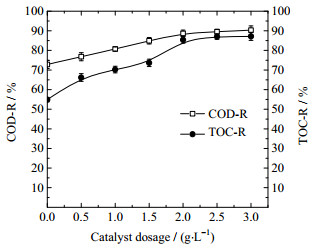 圖 6 催化劑用量對(duì)水樣COD和TOC去除率的影響