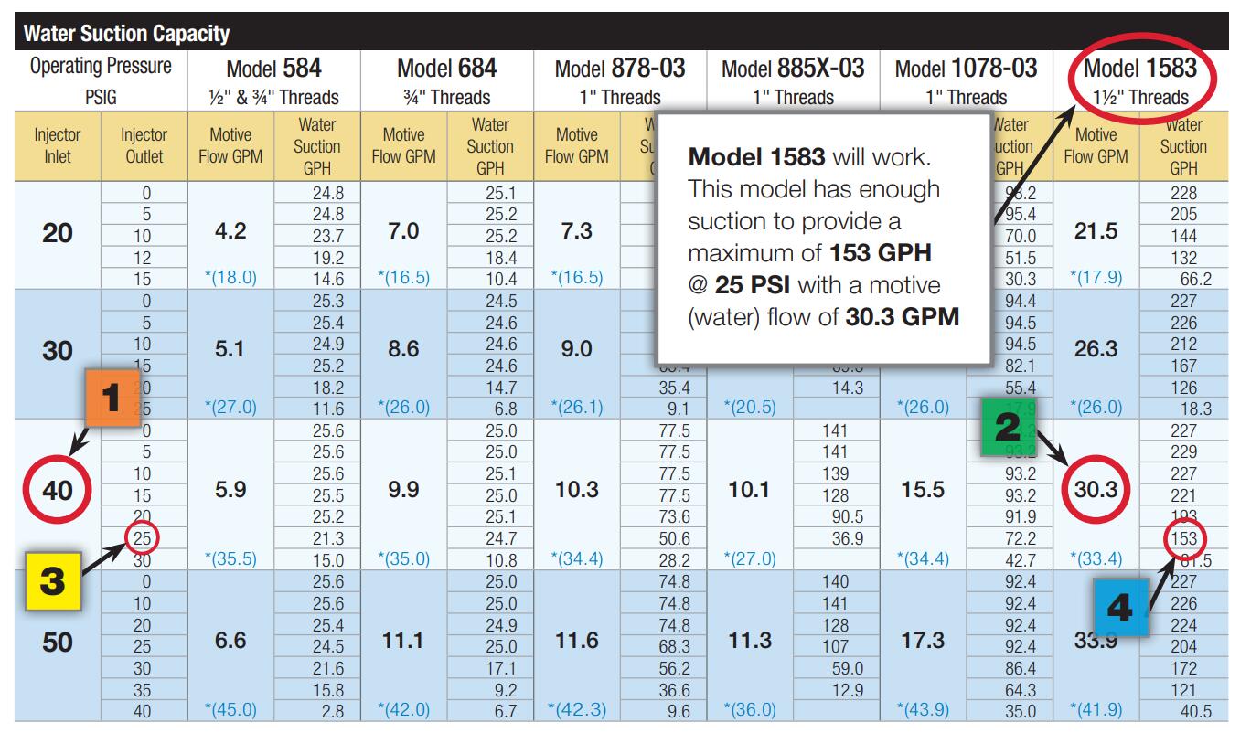 一位種植者計(jì)劃通過旁路向他的灌溉系統(tǒng)注入120 GPH(2 GPM)的液體肥料。他有40 PSI可用,下游需要保持25 PSI。他還希望通過旁路的水流量保持在每分鐘30加侖左右。根據(jù)種植者的要求,請(qǐng)參考下面的注入器性能表: