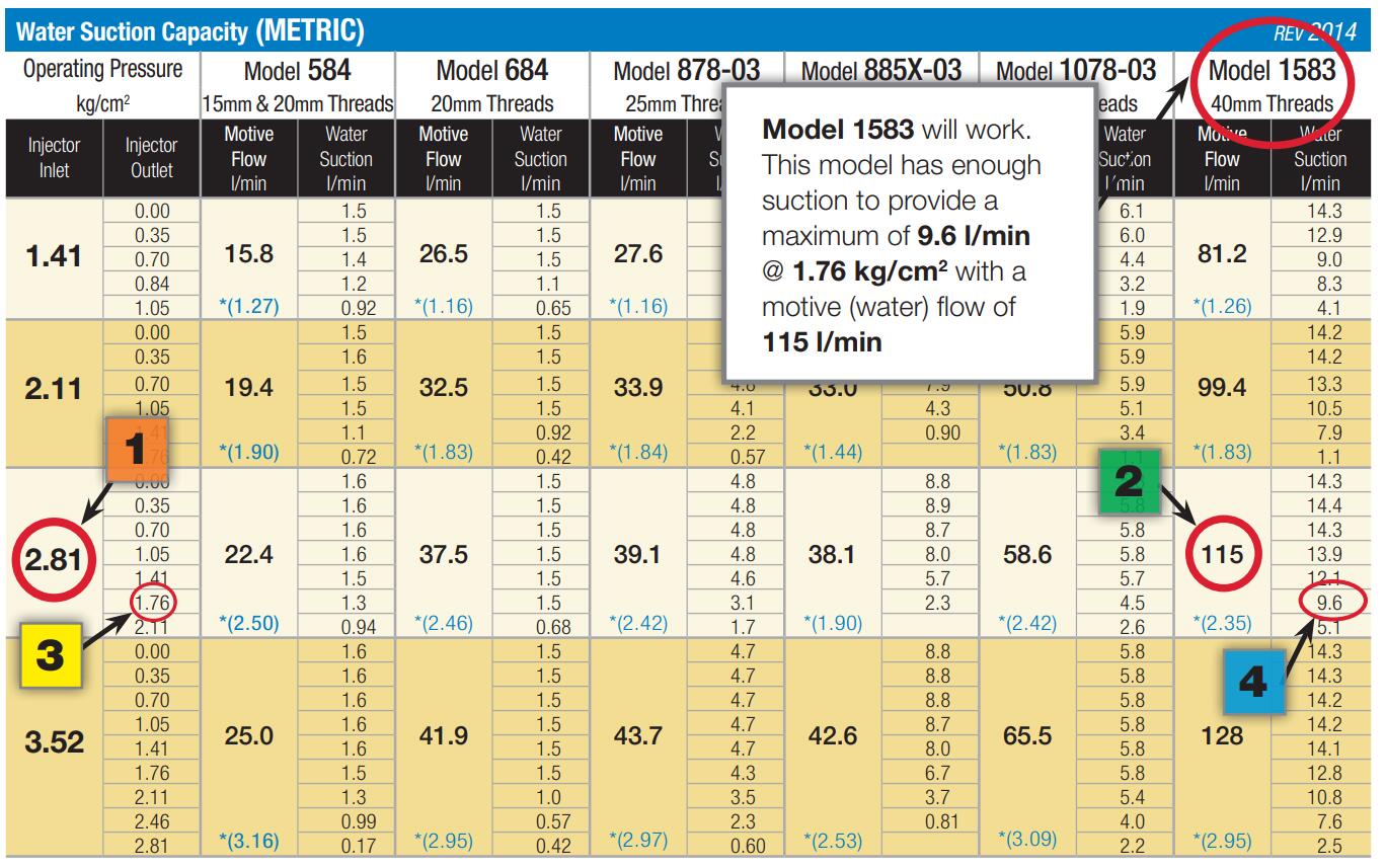 一位種植者計(jì)劃每分鐘通過旁路向他的灌溉系統(tǒng)注入7.57升的液體肥料。他有2.81 kg/cm2可用,下游需要保持1.76 kg/cm2。他還希望通過旁通的水流量保持在116升/分鐘左右。根據(jù)種植者的要求,請(qǐng)參考下面的注入器性能表: