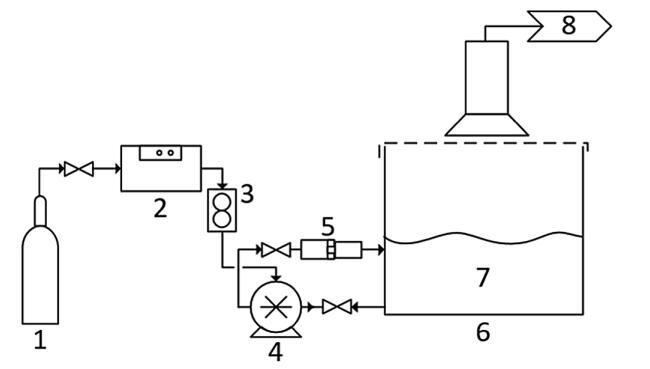 圖1所示。用于批量可處理性測(cè)試的中試系統(tǒng)。1.醫(yī)療氧氣;2. 臭氧發(fā)生器Magnum 200;3.。流量計(jì)(8l /min);4.微泵;5。靜態(tài)混合器;6.臭氧化反應(yīng)器;7.流出物;8.事件。