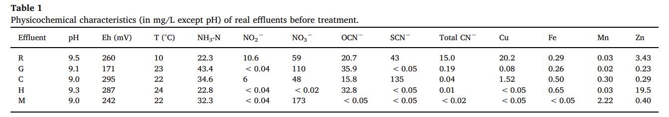 對(duì)位于加拿大QC Abitibi-Temiscamingue的五個(gè)金礦的真實(shí)廢水進(jìn)行了采樣(表1)。在礦山的不同點(diǎn)對(duì)廢水進(jìn)行了采樣:(1)脫水水;(2)更終出水;(3)尾礦庫(kù)(池)上清水,NH3-N濃度變化范圍為22.3 ~ 43.4 mg/L(表1)。