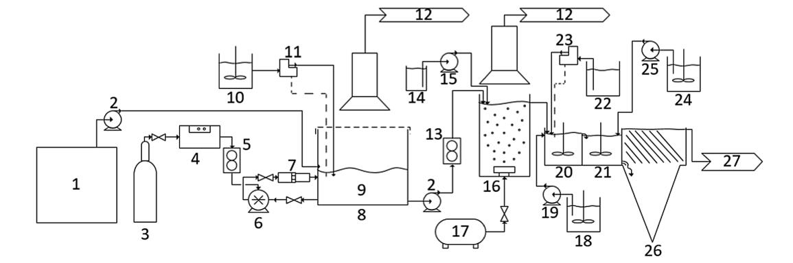 圖2所示。連續(xù)流臭氧凈化中試系統(tǒng)。1.出水M 800 L;2.泵;3.。醫(yī)療氧氣;4.臭氧發(fā)生器Magnum 200;5.流量計(jì);6.微泵;7.靜態(tài)混合器;8.臭氧化反應(yīng)器;9.出水M 100 L TRH = 1.5 h;10.2.5 N NaOH;11.pH值控制器;12.真空;13.流量計(jì);14.25%過(guò)氧化氫;15.泵;16.曝氣步驟;17.空氣;18.硫酸鐵;19.泵;20.。凝固;21.絮凝;22.Na2CO3;23.pH值控制器;24. Percol E10聚合物;25.泵;26.沉降槽;27.更后的廢水。