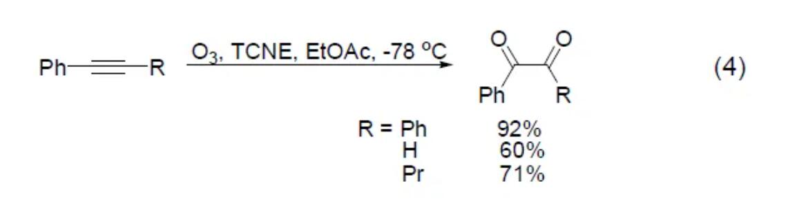 炔烴與臭氧的反應(yīng)比烯烴與臭氧的反應(yīng)慢[5]。當(dāng)同時有烯鍵和炔鍵存在時,烯鍵會優(yōu)先發(fā)生反應(yīng)。炔烴與臭氧反應(yīng)既可以產(chǎn)生羧酸,又可以產(chǎn)生α-二羰基化合物(還原后處理過程) (式4)[1]。很多還原試劑都可以用來生成α-二羰基化合物。端炔在臭氧作用下能夠得到α-羰基醛。