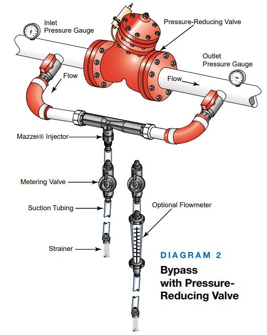 •Mazzei射流器需要壓差才能產(chǎn)生吸力。噴油器的出口壓力(背壓)必須充分低于進(jìn)口壓力。對于大多數(shù)型號,吸力從25-30%的壓差開始。為了確保吸力一致,噴射器的出口側(cè)應(yīng)充滿水或下游有一些阻力(背壓)。