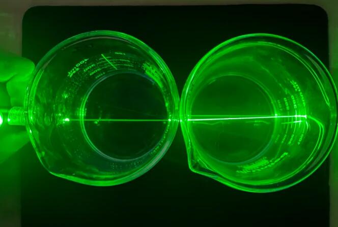 通過用廉價(jià)的綠色激光筆照射經(jīng)過納米氣泡處理的去離子水樣品,可以很容易地觀察液體中產(chǎn)生的納米氣泡。使用透明燒杯,可以采集含有納米氣泡的液體樣品以及沒有納米氣泡的去離子水的第二個(gè)對(duì)照樣品。激光筆射入水中的光線會(huì)發(fā)出熒光。光越亮(與對(duì)照樣品相比),納米氣泡的濃度越高,因?yàn)楣鈴乃械募{米氣泡折射而出。這是找出你是否產(chǎn)生了任何納米氣泡的快速方法。