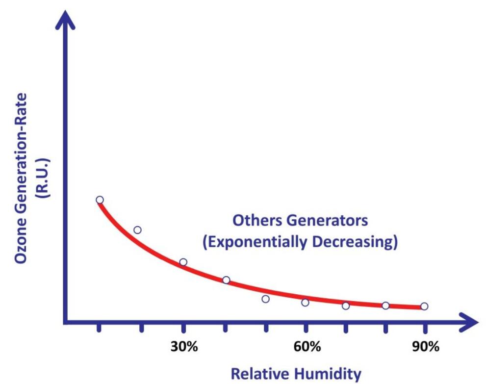 曲線(xiàn)顯示了傳統(tǒng)臭氧發(fā)生器(例如基于陶瓷板技術(shù)的臭氧發(fā)生器)的臭氧產(chǎn)生率,隨著空氣中濕度水平的增加,臭氧發(fā)生率呈指數(shù)下降。因此,這種傳統(tǒng)的臭氧發(fā)生器對(duì)于在正常濕度條件下的處理實(shí)際上效率低下,這些濕度條件通常高于50%RH。
